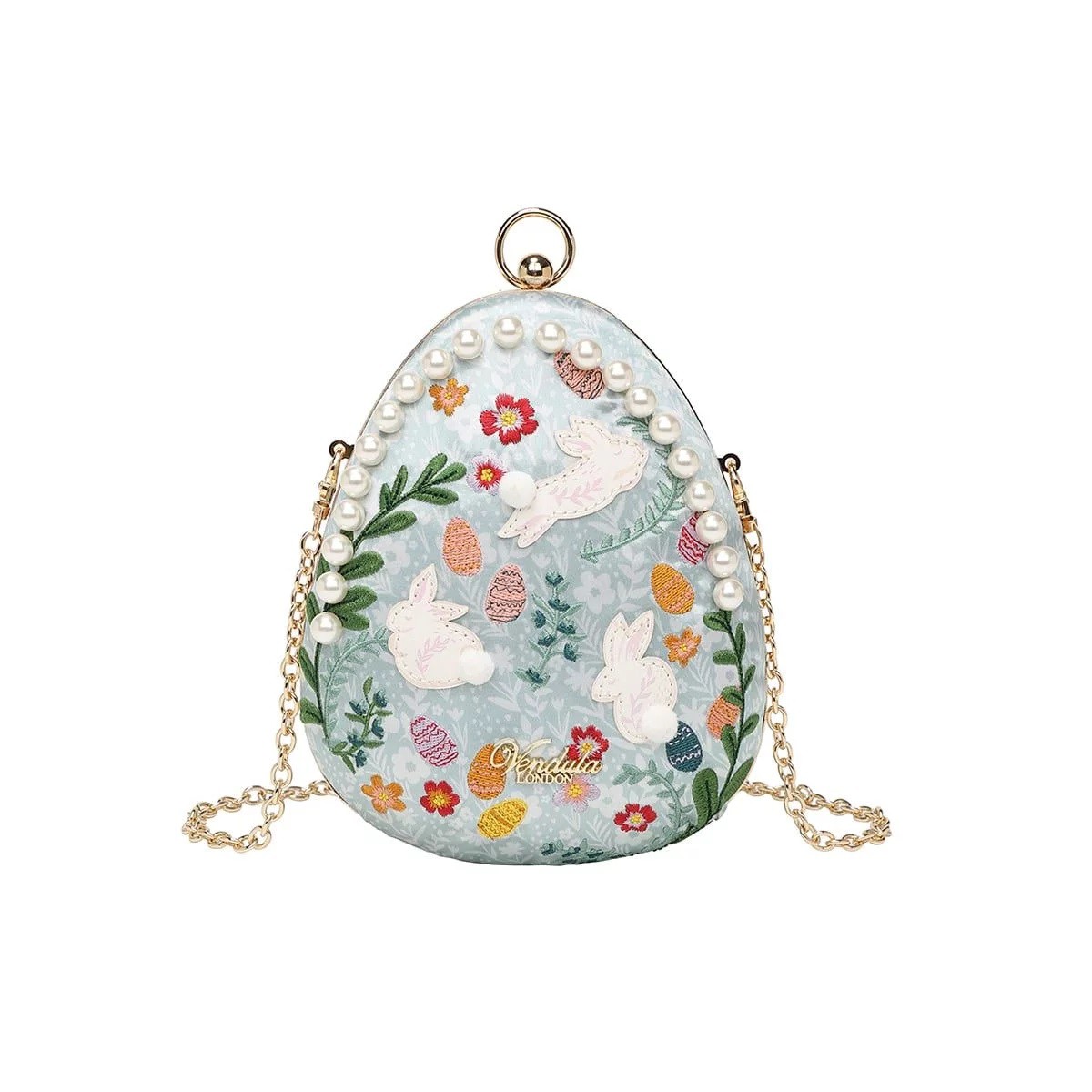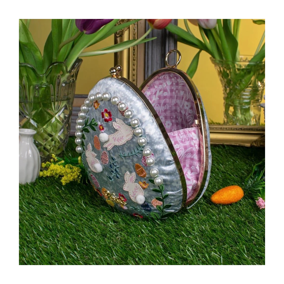 This bag made of printed satin is very elegant. It is shaped like an egg and decorated with pearls, bunnies and colorful Easter eggs. You can not only use it as a handbag, but also as a shoulder bag thanks to the detachable chain strap. It is just what you need on a special occasion, since it has a secure clasp closure, and it fits everything you need in your daily life or on a night out. It will perfectly complement your outfits and will make heads turn as you pass by. People will think you have a knack for finding the most unusual and groundbreaking bags.