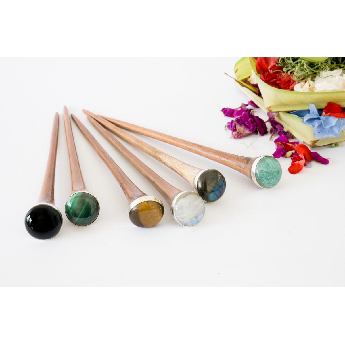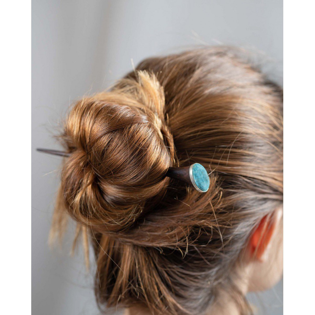 La joya más preciada. Una delicada piedra semipreciosa engarzada en un bisel de plata decora este bonito pincho para el pelo elaborado con madera de sono.