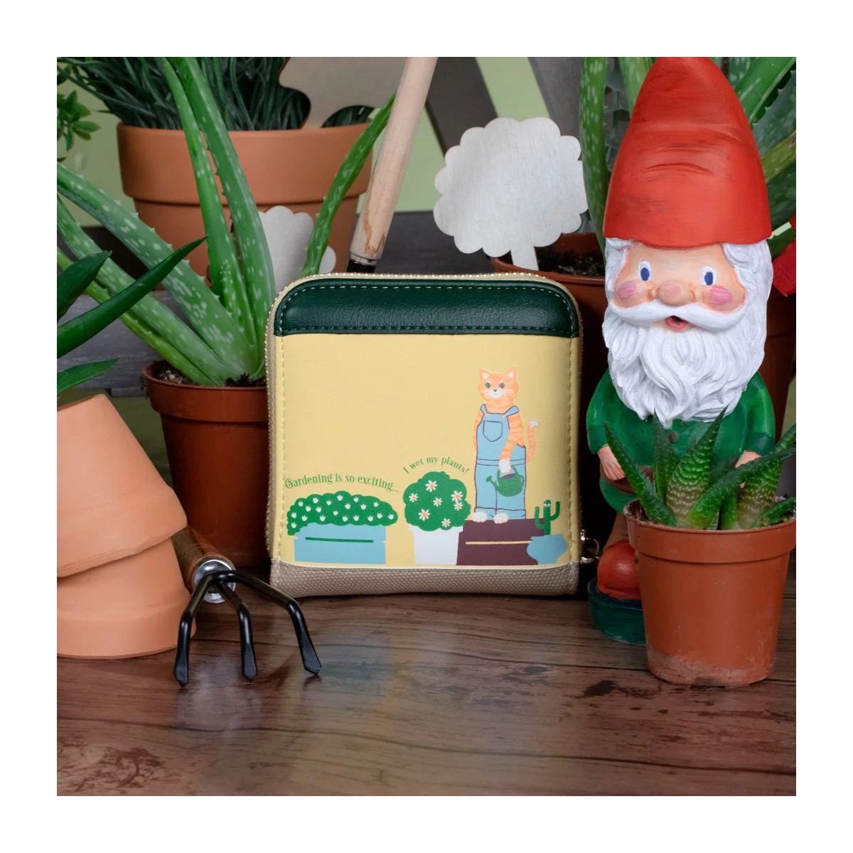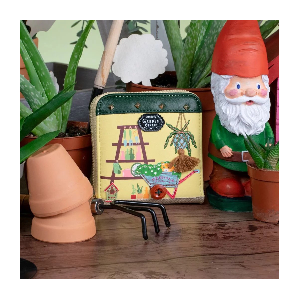La Cartera Cuadrada Vendula Garden Centre tiene mucho que ofrecer. Esta pequeña cartera amarilla de cuero vegano viene con un seguro cierre de cremallera alrededor, un cierre de presión para monedas, cuatro ranuras para tarjetas y espacio para billetes y recibos. Cabe en cualquier bolso y lo pueden usar Vendulettes de cualquier edad. También cuenta con decoración como la del resto de productos de Vendula Garden Centre, con una maceta colgante, una escalera llena de herramientas y frascos y una carretilla con un gato picaruelo escondido entre las flores. ¿A que es simplemente perfecto?