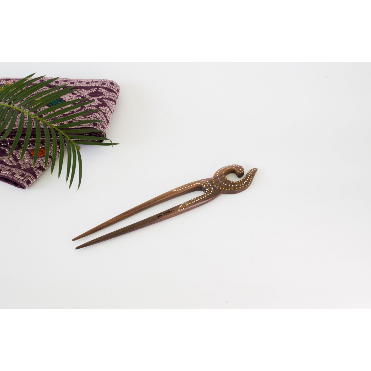 La belleza de estas piezas talladas de dos púas reside en la propia forma y color de la madera. Las decoraciones pintadas a mano están inspiradas en los antiguos estampados de batik.