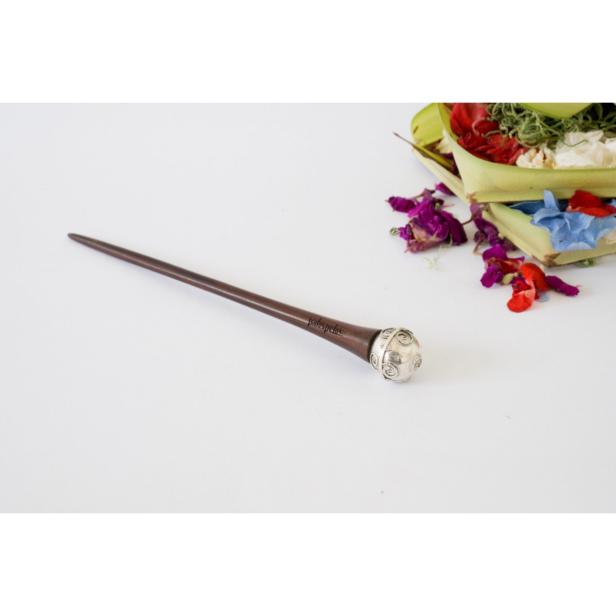 Un llamador de ángeles en plata de ley decora este bonito pincho para el pelo elaborado con madera de sono.
