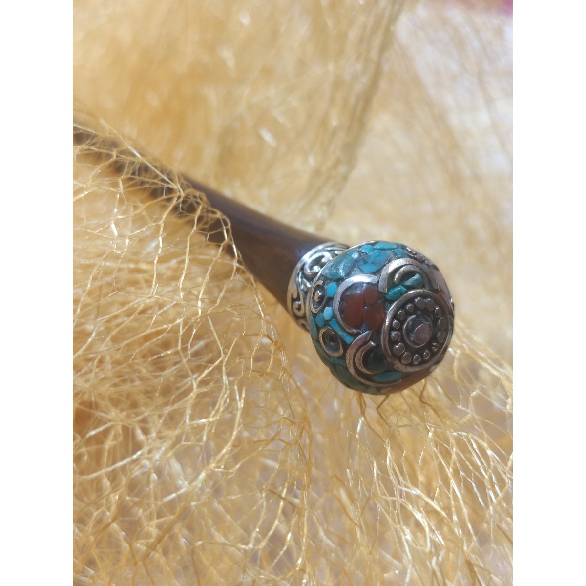 Preciosos abalorios del Nepal bañados en plata decoran estos bonitos pinchos para recoger el pelo