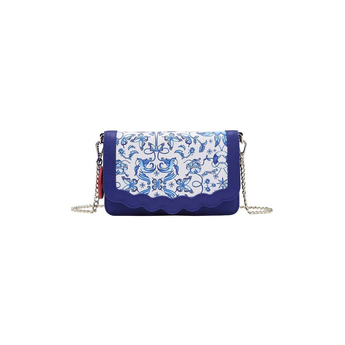 Este bonito bolso azul muestra tatuajes clásicos de marineros, como golondrinas, estrellas náuticas entre corazones, mariposas y rosas. Y el festoneado de la solapa, ¿no te recuerda a las olas del mar cuando rompen en la orilla?... ¡Y qué bonito es ese salvavidas!